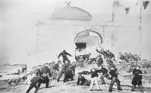 Lors de la guerre franco-marocaine, le , la France bombarde la cité. Des confédérations tribales voisines, les Chiadma et les Haha, en profitent pour piller la ville pendant 40 jours. À ce moment, selon l'administrateur colonial et historien Pierre de Cenival, les habitants ont déjà été évacués, une version différente est donnée par l'écrivain David Bensoussan pour qui le pillage occasionne de nombreux viols et enlèvements, en particulier parmi les juifs[L 16],[L 17]. Après le bombardement de Tanger et à la veille de la bataille d'Isly, un assaut est effectué sous les ordres du prince de Joinville sur l'îlot de Mogador et la ville, située à seulement 1,5 km. Plusieurs centaines d'hommes débarquent tout d'abord sur l'île où se trouvent des forts, une prison et une mosquée[L 18],[L 19]. Toutes les batteries de l'île sont neutralisées et plus de 400 Marocains sous les ordres du Caïd El Haj Larbi Torres sont capturés[L 20], après une farouche résistance, causant 14 tués et 64 blessés parmi les assaillants français[L 19]. La ville de Mogador est bombardée quant à elle pendant 26 heures, détruisant un nombre important d'habitations, avant un assaut terrestre sur le port de la ville, le , par environ 600 Français. Les batteries de la ville en grande partie détruites, les Français en profitent et capturent le port, détruisant les dernières batteries de la ville et coulant plusieurs navires[L 16],[L 19]. Le prince de Joinville décrit l'opération au ministère de la marine le :