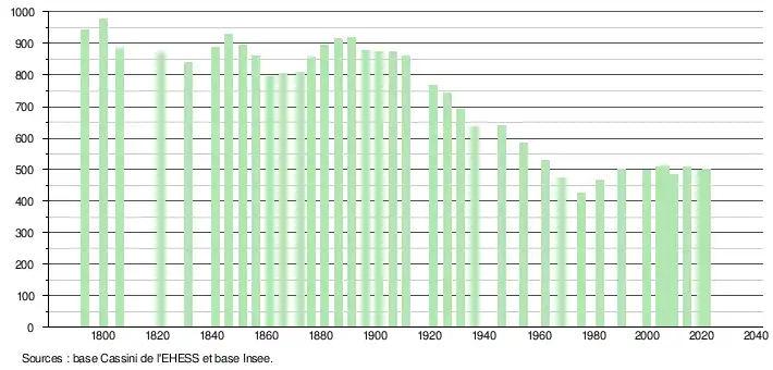 L'évolution du nombre d'habitants est connue à travers les recensements de la population effectués dans la commune depuis 1793. Pour les communes de moins de 10 000 habitants, une enquête de recensement portant sur toute la population est réalisée tous les cinq ans, les populations légales des années intermédiaires étant quant à elles estimées par interpolation ou extrapolation[41]. Pour la commune, le premier recensement exhaustif entrant dans le cadre du nouveau dispositif a été réalisé en 2004[42].