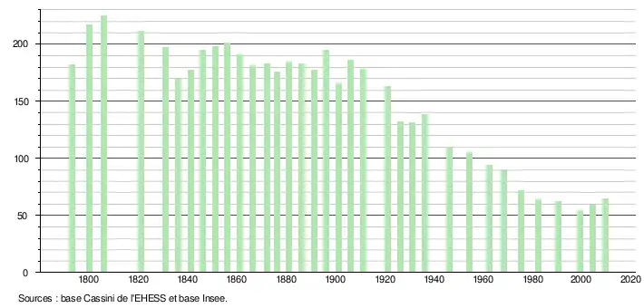 L'évolution du nombre d'habitants est connue à travers les recensements de la population effectués dans la commune depuis 1793. À partir du , les populations légales des communes sont publiées annuellement dans le cadre d'un recensement qui repose désormais sur une collecte d'information annuelle, concernant successivement tous les territoires communaux au cours d'une période de cinq ans. Pour les communes de moins de 10 000 habitants, une enquête de recensement portant sur toute la population est réalisée tous les cinq ans, les populations légales des années intermédiaires étant quant à elles estimées par interpolation ou extrapolation[2]. Pour la commune, le premier recensement exhaustif entrant dans le cadre du nouveau dispositif a été réalisé en 2004[3],[Note 1].