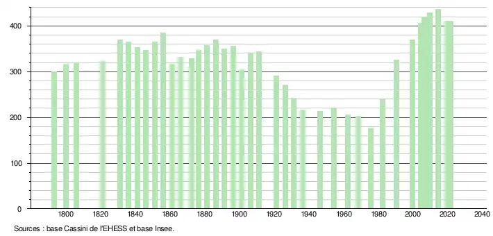 L'évolution du nombre d'habitants est connue à travers les recensements de la population effectués dans la commune depuis 1793. Pour les communes de moins de 10 000 habitants, une enquête de recensement portant sur toute la population est réalisée tous les cinq ans, les populations légales des années intermédiaires étant quant à elles estimées par interpolation ou extrapolation[21]. Pour la commune, le premier recensement exhaustif entrant dans le cadre du nouveau dispositif a été réalisé en 2004[22].