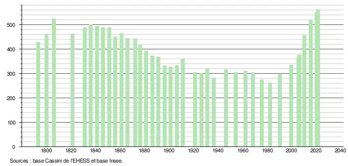 L'évolution du nombre d'habitants est connue à travers les recensements de la population effectués dans la commune depuis 1793. Pour les communes de moins de 10 000 habitants, une enquête de recensement portant sur toute la population est réalisée tous les cinq ans, les populations légales des années intermédiaires étant quant à elles estimées par interpolation ou extrapolation[23]. Pour la commune, le premier recensement exhaustif entrant dans le cadre du nouveau dispositif a été réalisé en 2005[24].