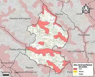 Le retrait-gonflement des sols argileux est susceptible d'engendrer des dommages importants aux bâtiments en cas d’alternance de périodes de sécheresse et de pluie. 30,9 % de la superficie communale est en aléa moyen ou fort (94,5 % au niveau départemental et 48,5 % au niveau national). Sur les 461 bâtiments dénombrés sur la commune en 2019, 132 sont en aléa moyen ou fort, soit 29 %, à comparer aux 93 % au niveau départemental et 54 % au niveau national. Une cartographie de l'exposition du territoire national au retrait gonflement des sols argileux est disponible sur le site du BRGM[20],[Carte 2].