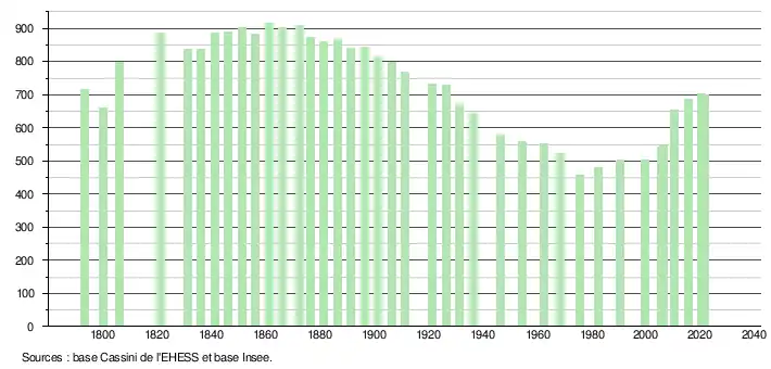 | L'évolution du nombre d'habitants est connue à travers les recensements de la population effectués dans la commune depuis 1793. Pour les communes de moins de 10 000 habitants, une enquête de recensement portant sur toute la population est réalisée tous les cinq ans, les populations légales des années intermédiaires étant quant à elles estimées par interpolation ou extrapolation[23]. Pour la commune, le premier recensement exhaustif entrant dans le cadre du nouveau dispositif a été réalisé en 2005[24]. En 2021, la commune comptait 699 habitants[Note 4], en augmentation de 2,04 % par rapport à 2015 (Landes : +4,9 %, France hors Mayotte : +1,84 %). |