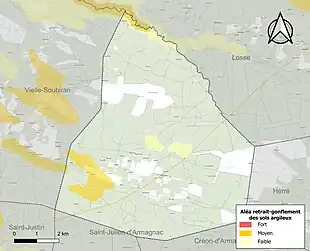 Le retrait-gonflement des sols argileux est susceptible d'engendrer des dommages importants aux bâtiments en cas d’alternance de périodes de sécheresse et de pluie. 4,5 % de la superficie communale est en aléa moyen ou fort (19,2 % au niveau départemental et 48,5 % au niveau national). Sur les 58 bâtiments dénombrés sur la commune en 2019, 4 sont en aléa moyen ou fort, soit 7 %, à comparer aux 17 % au niveau départemental et 54 % au niveau national. Une cartographie de l'exposition du territoire national au retrait gonflement des sols argileux est disponible sur le site du BRGM[21],[Carte 2].