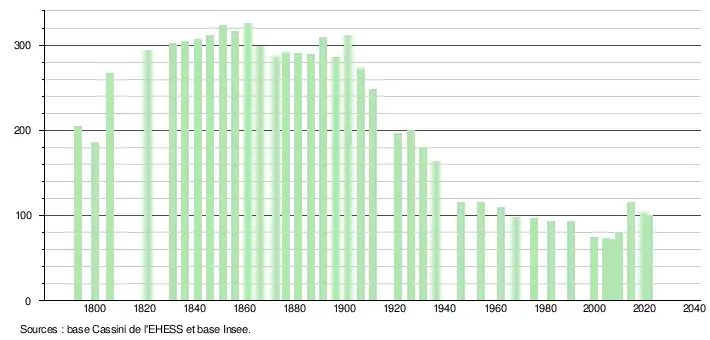 L'évolution du nombre d'habitants est connue à travers les recensements de la population effectués dans la commune depuis 1793. Pour les communes de moins de 10 000 habitants, une enquête de recensement portant sur toute la population est réalisée tous les cinq ans, les populations légales des années intermédiaires étant quant à elles estimées par interpolation ou extrapolation[22]. Pour la commune, le premier recensement exhaustif entrant dans le cadre du nouveau dispositif a été réalisé en 2004[23].