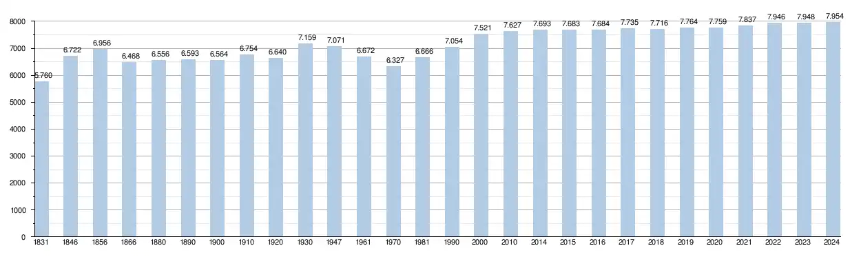 Elle comptait, au , 7 968 habitants (3 938 hommes et 4 030 femmes) [15], soit une densité de 108,72 habitants/km² pour une superficie de 73,29 km²[16].