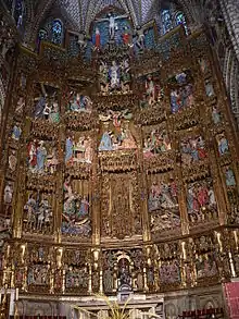 La surface sculptée est recouverte d'une couche de feuille d'or pur sur laquelle est appliquée une couche de bolus d'argile[1] pouvant avoir des couleurs allant du rouge orangé au brun foncé. La feuille d'or est ensuite recouverte de couleur. Les teintes appliquées étaient différentes car le contraste avec l'or devait être chromatiquement efficace : vert, bleu, rouge, noir et blanc. Par la suite, la couleur était exportée par grattage avec un outil spécial appelé pissenlit pour libérer les parties où l'or devait refaire surface. L'ensemble prenait une couleur vive et chatoyante. Les premiers motifs décoratifs identifiés sont à thème géométrique avec des formes carrées, en losange ou à mailles fermées, lobées ou ouvertes composées de volutes en C et en S enchaînées ou en forme ogivales. À l'intérieur de ces mailles, des motifs décoratifs étaient insérés, généralement des motifs floraux ou de feuilles de chardon. Les fleurs aux pétales ressemblaient à la croix, la feuille de chardon crochue ou épineuse faisait allusion à la passion du Christ. Par rapport à ces modèles, il existait également un autre système, celui de la décoration libre dans lequel toute la surface était travaillée à la main sans avoir de motifs de référence géométriques. C'est un courant thématique qui commence à la fin du XVe siècle et dure jusqu'au début du XVIIIe siècle.