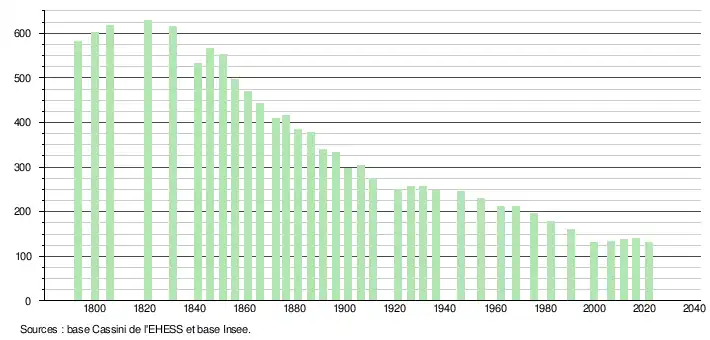L'évolution du nombre d'habitants est connue à travers les recensements de la population effectués dans la commune depuis 1793. Pour les communes de moins de 10 000 habitants, une enquête de recensement portant sur toute la population est réalisée tous les cinq ans, les populations légales des années intermédiaires étant quant à elles estimées par interpolation ou extrapolation[22]. Pour la commune, le premier recensement exhaustif entrant dans le cadre du nouveau dispositif a été réalisé en 2006[23].