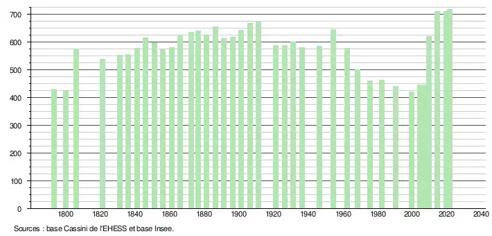 L'évolution du nombre d'habitants est connue à travers les recensements de la population effectués dans la commune depuis 1793. Pour les communes de moins de 10 000 habitants, une enquête de recensement portant sur toute la population est réalisée tous les cinq ans, les populations légales des années intermédiaires étant quant à elles estimées par interpolation ou extrapolation[32]. Pour la commune, le premier recensement exhaustif entrant dans le cadre du nouveau dispositif a été réalisé en 2004[33].