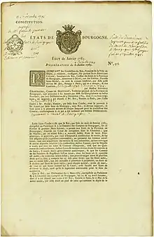 - Les villes de : Cuiseaux, Verdun-sur-le-Doubs, Saint-Laurent[18], Louhans et Cuisery de l'ex-comté d'Auxonne ; Paray-le-Monial, Mont-Saint-Vincent et Perrecy, villes du Charolais « alternaient » pour la désignation des députés. Quatre villes de l'Auxerrois avaient une représentation directe et le Mâconnais était représenté par deux députés[17]. Les pays de l'Ain, la Bresse, le Bugey, le pays de Gex avaient aussi un mode de représentation particulier pour la distribution de l'impôt.