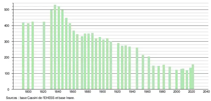 L'évolution du nombre d'habitants est connue à travers les recensements de la population effectués dans la commune depuis 1793. Pour les communes de moins de 10 000 habitants, une enquête de recensement portant sur toute la population est réalisée tous les cinq ans, les populations légales des années intermédiaires étant quant à elles estimées par interpolation ou extrapolation[51]. Pour la commune, le premier recensement exhaustif entrant dans le cadre du nouveau dispositif a été réalisé en 2008[52].