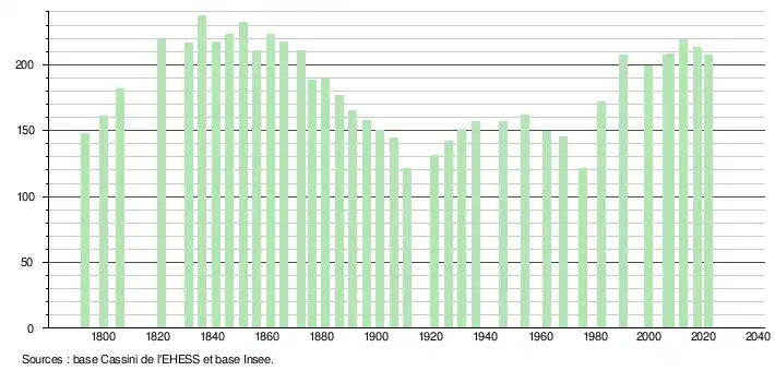 L'évolution du nombre d'habitants est connue à travers les recensements de la population effectués dans la commune depuis 1793. Pour les communes de moins de 10 000 habitants, une enquête de recensement portant sur toute la population est réalisée tous les cinq ans, les populations légales des années intermédiaires étant quant à elles estimées par interpolation ou extrapolation[20]. Pour la commune, le premier recensement exhaustif entrant dans le cadre du nouveau dispositif a été réalisé en 2007[21].