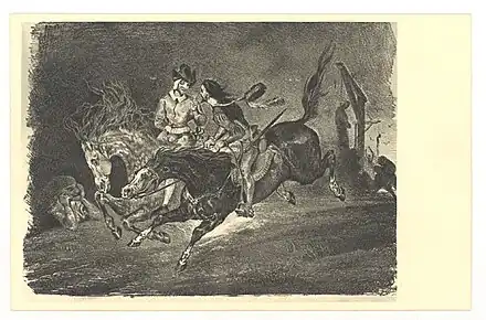 En 1828, Charles Motte, éditeur rue des Marais, publie Faust, la tragédie de Goethe traduite par Philipp Albert Stapfer, illustrée d’une suite de 17 lithographies par Delacroix. Goethe témoigne de son enthousiasme dans une lettre adressée de Weimar à son ami Johann Peter Eckermann et estime qu’il a bien su traduire les scènes qu’il avait imaginées[92].
