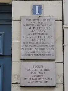 Eugène Emmanuel Viollet-le-Duc naît au no 1 de la rue Chabanais (aujourd'hui dans le 2e arrondissement de Paris). Il est le fils d'Emmanuel-Louis-Nicolas Viollet-le-Duc (1781-1857)[24], conservateur des résidences royales à l'intendance générale de la liste civile sous le règne de Louis-Philippe Ier, dès 1832[25], homme de lettres (Nouvel Art poétique, Paris, Martinet, 1809) et d'Élisabeth Eugénie Delécluze (1785-1832)[26], fille de l'architecte Jean-Baptiste Delécluze (1745-v. 1805), femme du monde qui tenait un salon où était reçu, entre autres, Stendhal.