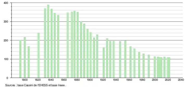 L'évolution du nombre d'habitants est connue à travers les recensements de la population effectués dans la commune depuis 1793. Pour les communes de moins de 10 000 habitants, une enquête de recensement portant sur toute la population est réalisée tous les cinq ans, les populations légales des années intermédiaires étant quant à elles estimées par interpolation ou extrapolation[17]. Pour la commune, le premier recensement exhaustif entrant dans le cadre du nouveau dispositif a été réalisé en 2004[18].