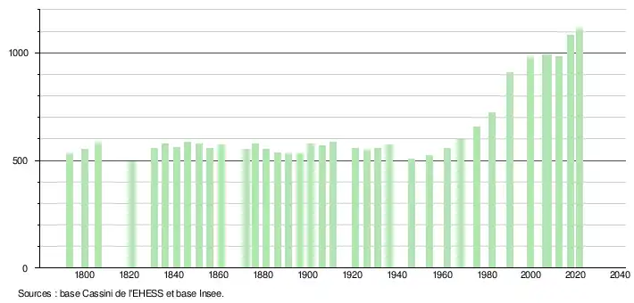 L'évolution du nombre d'habitants est connue à travers les recensements de la population effectués dans la commune depuis 1793. Pour les communes de moins de 10 000 habitants, une enquête de recensement portant sur toute la population est réalisée tous les cinq ans, les populations légales des années intermédiaires étant quant à elles estimées par interpolation ou extrapolation[11]. Pour la commune, le premier recensement exhaustif entrant dans le cadre du nouveau dispositif a été réalisé en 2007[12].