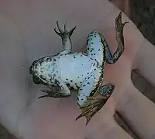 Cette grenouille aquatique a une taille variant de 4 à 6,5 cm.