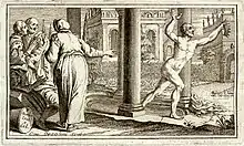 Cette légende est due à Vitruve qui la raconte dans son De architectura : « Un jour que, tout occupé de cette pensée, Archimède était entré dans une salle de bains, il s'aperçut par hasard qu'à mesure que son corps s'enfonçait dans la baignoire, l'eau passait par-dessus les bords. Cette découverte lui donna l'explication de son problème. Il s'élance immédiatement hors du bain, et, dans sa joie, se précipite vers sa maison, sans songer à s'habiller. Dans sa course rapide, il criait de toutes ses forces qu'il avait trouvé ce qu'il cherchait, disant en grec : « Εὕρηκα, Εὕρηκα »[1]. ».