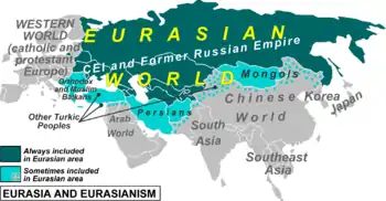 Au sens géopolitique, l'Eurasie se réfère à une conception politique : l'eurasisme qui ancre la fédération de Russie (autrefois l'URSS) dans la masse continentale et tente de porter vers l'Asie l'eurocentrisme traditionnel des élites russes. Selon cette doctrine le terme Eurasie ne désigne pas l'ensemble formé par l'Europe et l'Asie mais la zone intermédiaire entre l'Europe et l'Asie.