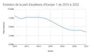 Le 12 juillet 2023, Médiamétrie publie les résultats de la nouvelle vague d'audiences : Europe 1 passe sous la barre des 2 millions d'auditeurs par jour, son plus bas niveau historique qui ne permet à la radio que de se classer au 11e rang, avec à peine 1.963.000 auditeurs[82].
