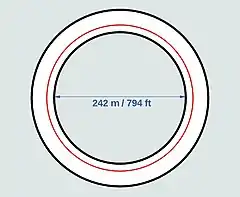 L'anneau technique de circulation des électrons fait 844 mètres de circonférence[20] (soit 269 m de diamètre), mais le bâtiment l'abritant fait environ 760 mètres pour son côté intérieur et environ 1 020 mètres pour son côté extérieur[21]. Un passage surélevé permet de franchir l'anneau afin d'y faire accéder des véhicules dans sa partie centrale.