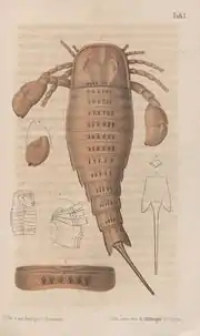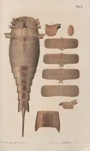 | Eurypterus cephalaspis | Salter, 1856 | Silurien | Angleterre | Classification incertaine. Seuls trois des spécimens décrits en 1856 sont probablement des Eurypterus, les autres appartenant probablement aux Hughmilleriidae. Son nom signifie « tête de bouclier », du grec κεφαλή (kephalē « tête ») et ἀσπίς (aspis « bouclier ou bol »). Spécimens découverts dans le Herefordshire, en Angleterre[25],[24]. |