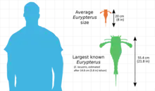 Les Euryptérides sont les plus grands arthropodes ayant jamais existé. L'espèce connue la plus grande, Jaekelopterus rhenaniae, faisait jusqu'à 2,5 m (8,2 pi) de long, à peu près la taille d'un crocodile[8]. Cependant, les espèces d’Eurypterus étaient beaucoup plus petites.
