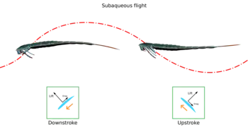 Une hypothèse alternative concernant le comportement de nage d’Eurypterus est que les individus étaient capables de voler sous l'eau (nage de type « vol sous-marin »), les mouvements sinueux et la forme des palettes suffisant à générer de la portance, comme le font les hydroptères[29]. Ce comportement de nage est similaire à celui utilisé par les tortues marines et les lions de mer. Le taux d'accélération est relativement plus lent qu'avec la pratique de l'aviron, d'autant que les adultes ont des pagaies proportionnellement plus petites que les juvéniles. Mais comme les adultes, de plus grande taille, génèrent un coefficient de traînée plus élevé, l'utilisation de ce type de propulsion est plus économe en énergie[23],[30].