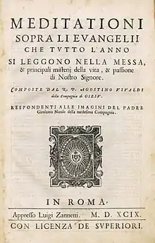 L'ouvrage ne fut ainsi publié de façon posthume que plus de 10 ans plus tard, en 1593, grâce au travail éditorial du père Diego Jiménez. L'éditeur, Martinus Nutius, reçut le privilège du pape Clément III, signé par Vestrius Barbianus le [N 2] pour autoriser la publication des Adnotationes et meditationes, les textes de Jérôme Nadal qui seront accompagnés des gravures[4],[5].