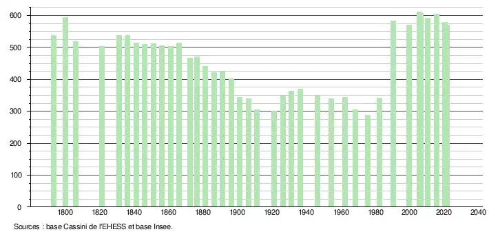- Population municipale légale en vigueur au 1er janvier 2024, millésimée 2021, définie dans les limites territoriales en vigueur au 1er janvier 2023, date de référence statistique : 1er janvier 2021.