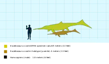 Excalibosaurus est apparenté à deux autres genres d'ichtyosaures, Leptonectes du Rhétien (Trias supérieur) au Sinémurien (Jurassique inférieur) d'Angleterre et Eurhinosaurus du Toarcien (Jurassique inférieur) d'Allemagne. Les trois genres sont regroupés dans la famille Leptonectidae[3] et le sous-ordre Eurhinosauria[4]. On pensait autrefois qu'Excalibosaurus était un synonyme junior d'Eurhinosaurus[5], mais la description du spécimen de 1996 montre de nombreuses différences morphologiques telles que la forme du forefin (beaucoup plus court et plus large chez Excalibosaurus), la forme élancée du corps, qui différencient clairement les deux genres[2]. La longueur estimée du corps du spécimen de 1996 est de 7 m avec un crâne de 1,54 m de long. Le spécimen holotype était beaucoup plus petit, avec une longueur de crâne de 0,785 m et une longueur de corps estimée à 4 m, indiquant qu'il s'agissait d'un juvénile.