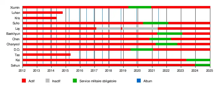 EXO (coréen : 엑소) est un groupe sud-coréo-chinois formé en 2011 et produit par le label SM Entertainment. Le groupe était anciennement composé de 12 membres : six faisaient la promotion des EXO en Corée du Sud : les EXO-K comprenant Suho, Kai, D.O, Sehun, Baekhyun et Chanyeol, et six autres faisaient la promotion en Chine : les EXO-M avec Lay, Tao, Luhan, Chen, Xiumin et Kris. Pour diverses raisons, le groupe ne compte plus que neuf membres à la suite des départs de trois membres du sous-groupe EXO-M (Wu Yifan, Lu Han et Zitao Huang).