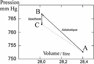 En 1819, Nicolas Clément et Charles Desormes publient les données détaillées de l'expérience qu'ils ont conçue[2] et qui donnera lieu par la suite à des développements théoriques importants. Au lieu de comprimer l'air contenu dans un ballon comme dans l'exemple précédent ils commencent par le détendre de 2 % environ. En faisant entrer un instant de l'air dans le ballon ils y rétablissent la pression ambiante. Cette compression adiabatique échauffe aussitôt le gaz, qui ensuite se remet peu à peu à la température ambiante ce qui abaisse légèrement sa pression.