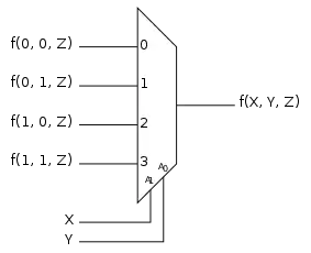 Le théorème d'expansion de Shannon permet de séparer des variables que l'on considèrera principales, les autres étant des variables secondaires ou introduites. Il permet notamment de faire correspondre une équation avec les entrées d'un multiplexeur. En effet, une fois l'équation décomposée sous la forme de Shannon, il est possible de réaliser l'identité des variables principales avec les termes produits d'une table de vérité. Ainsi, dans l'exemple suivant :