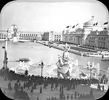 Vue sur la Cour d'honneur et son Grand Bassin avec la statue de la République et l'Administration Building (mai 1893). | |||