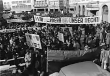 À la conférence de Potsdam, les territoires à l'est de la ligne Oder-Neisse furent officiellement cédés à la Pologne. Toutes les propriétés allemandes furent confisquées. Le gouverneur de Silésie, Aleksander Zawadzki expropria tous les Allemands par décret du et émit le un autre décret selon lequel toute possession « abandonnée » appartenait au gouvernement polonais[80]. De plus, les Allemands ne furent pas autorisés à posséder de la monnaie polonaise autre que celle issue de leur salaire[81]. Les Allemands restants étaient de facto privés de tous leurs droits et durent faire face aux pillages, aux vols et dans certains cas à des viols et des meurtres de la part de la milice polonaise, ces actes n'étaient pas sanctionnés par la justice polonaise[82].