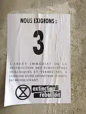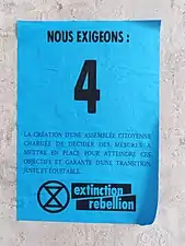 Les revendications de l'organisation Extinction Rebellion portent sur la reconnaissance par les médias et les différents gouvernements nationaux de la gravité de la crise écologique, la réduction des émissions de dioxyde de carbone (de sorte à atteindre la neutralité carbone en 2025 pour la France), la fin de la dévastation des écosystèmes planétaires et la création d'une assemblée citoyenne chargée de mettre en œuvre la transition écologique[45],[33],[46],[47]. La branche française a la spécificité d'avoir séparé dans ses revendications la neutralité carbone et la fin de l'écocide, qui ailleurs dans le monde, ne font qu'une seule et même revendication[48],[49].
