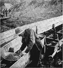 La prospection minière à petite échelle utilisait couramment des rampes de lavage (dites boites d’écluse ou pour les anglophones sluice box ou sluice ou longtom) constituées d’un canal artificiel de bois dans lequel on fait couler un mélange de sédiment à traiter et d’eau pour en extraire l’or.