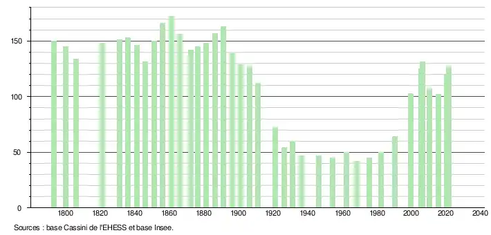 L'évolution du nombre d'habitants est connue à travers les recensements de la population effectués dans la commune depuis 1793. Pour les communes de moins de 10 000 habitants, une enquête de recensement portant sur toute la population est réalisée tous les cinq ans, les populations légales des années intermédiaires étant quant à elles estimées par interpolation ou extrapolation[17]. Pour la commune, le premier recensement exhaustif entrant dans le cadre du nouveau dispositif a été réalisé en 2005[18].