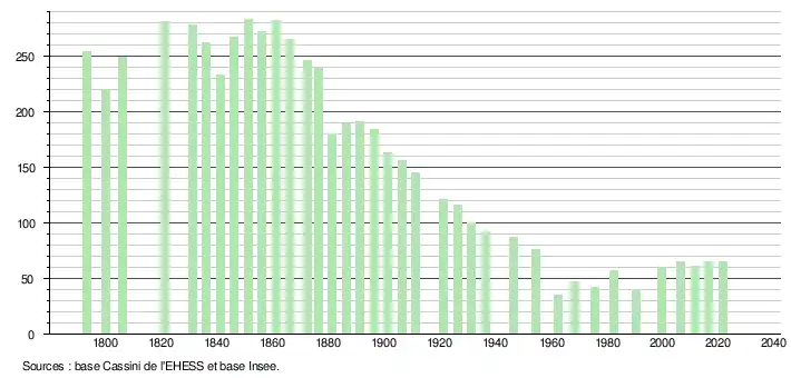 L'évolution du nombre d'habitants est connue à travers les recensements de la population effectués dans la commune depuis 1793. Pour les communes de moins de 10 000 habitants, une enquête de recensement portant sur toute la population est réalisée tous les cinq ans, les populations légales des années intermédiaires étant quant à elles estimées par interpolation ou extrapolation[19]. Pour la commune, le premier recensement exhaustif entrant dans le cadre du nouveau dispositif a été réalisé en 2006[20].