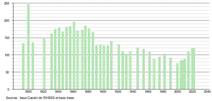 L'évolution du nombre d'habitants est connue à travers les recensements de la population effectués dans la commune depuis 1793. Pour les communes de moins de 10 000 habitants, une enquête de recensement portant sur toute la population est réalisée tous les cinq ans, les populations légales des années intermédiaires étant quant à elles estimées par interpolation ou extrapolation[18]. Pour la commune, le premier recensement exhaustif entrant dans le cadre du nouveau dispositif a été réalisé en 2004[19].