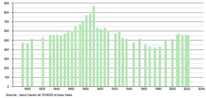 L'évolution du nombre d'habitants est connue à travers les recensements de la population effectués dans la commune depuis 1793. Pour les communes de moins de 10 000 habitants, une enquête de recensement portant sur toute la population est réalisée tous les cinq ans, les populations légales des années intermédiaires étant quant à elles estimées par interpolation ou extrapolation[41]. Pour la commune, le premier recensement exhaustif entrant dans le cadre du nouveau dispositif a été réalisé en 2008[42].