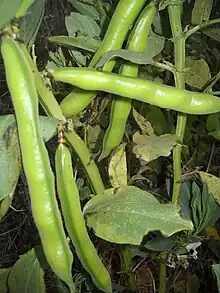 Le fruit est une gousse contenant des graines de forme ovale et aplatie avec une peau épaisse, les fèves qui ont la forme d'un gros haricot aplati.