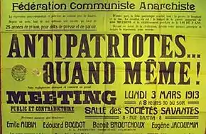 Poursuivant sa campagne antimilitariste de l’automne 1912 (pour le « départ de la classe », c’est-à-dire l’entrée au régiment d’une classe d’âge), une nouvelle affiche est publiée en 1913, titrée « Antipatriotes... quand même ! », qui attire les foudres de la répression : 8 militants récoltent au total 25 années de prison. La FCA organise un meeting le , à la tribune : Émile Aubin, Édouard Boudot, Benoît Broutchoux[10] et Eugène Jacquemin.