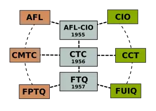 En 1954, l'AFL et le CIO concluent un pacte de non-maraudage; les pendant canadiens des deux organisations, le Congrès des métiers et du travail du Canada (CMTC) et Congrès canadien du travail (CCT) concluent une entente similaire l'année suivante. La fusion de l'AFL et de la CIO est réalisée en ; la fusion du CMTC et du CCT survient en . En , le 19e congrès de la Fédération provinciale du travail (FPTQ) dans la ville de Québec ratifie à l'unanimité la constitution et l'accord de fusion avec la FUIQ pour la formation de la nouvelle FTQ. La FUIQ adopte l'accord de fusion et la nouvelle constitution à son congrès les et .