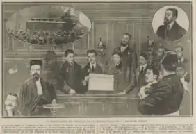 Le premier procès fait à un Camelot du Roi a lieu le 24 décembre : Serge Real del Sarte, élève à l'école des Beaux-Arts, est accusé de « violence à agent »[14]. Le même jour, un groupe de cinq cents manifestants, conduit par son frère Maxime et les Camelots, se dirige vers le Sénat et envahit la cour du palais aux cris de « À bas la République ». Pour se faire connaître, les Camelots du Roi n'hésitent pas à se faire arrêter volontairement pour comparaître en procès public et pour faire parler d'eux dans la presse.
