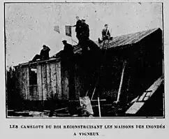Du 17 février au 20 avril à Vigneux, les Camelots du roi bâtissent et meublent vingt-cinq baraquements pour des ouvriers, avec le concours de la marquise de Mac Mahon et de l'Association des Jeunes filles royalistes[22].