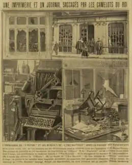 Le 22 janvier 1923, le secrétaire général des Camelots du roi, Marius Plateau, est assassiné par Germaine Berton, une militante anarchiste pour venger Jean Jaurès, Miguel Almereyda et protester contre l’occupation de la Ruhr[43]. Décapités, les Camelots du roi laissent libre cours à leur fureur en saccageant des bureaux et des imprimeries de trois journaux de gauche : L’Œuvre, L’Ère nouvelle et Bonsoir. Cette fois, l’opinion publique ne soutient pas les Camelots et Le Populaire écrit : « quelqu’un (Germaine Berton) a osé retourner les méthodes des Camelots contre eux ».[réf. souhaitée]