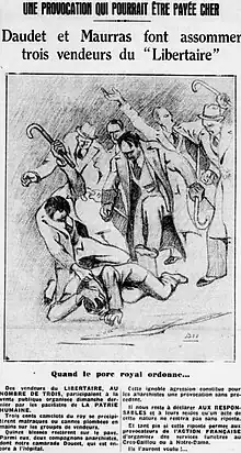 Le soir du 31 mai 1923, le catholique Marc Sangnier, le radical Maurice Viollette et le socialiste Marius Moutet doivent s’exprimer lors d’un meeting salle des sociétés savantes contre le « fascisme français »[44]. Mais les Camelots du Roi agressent les trois hommes en les battant et enduisant de goudron et d'encre d'imprimerie. Les victimes échappent de justesse à un traitement à l'huile de ricin[45]. Le lendemain, les communistes, les socialistes et, pour la première fois, les radicaux expriment leur profond mécontentement. Les radicaux, par la voix de leur chef Édouard Herriot, demandent au gouvernement de réaffirmer son caractère républicain.[réf. souhaitée] À cause de cette agression, les Camelots du Roi furent surnommés les « apaches du Roy » dans plusieurs titres de presse[46],[47],[48].