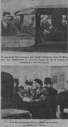 Le 13 février 1936, lors des obsèques de l'historien royaliste Jacques Bainville, Léon Blum fend le cortège en voiture, boulevard Saint-Germain, à Paris. Reconnaissant le député socialiste, un groupe de Camelots du roi, emmené par le cagoulard Jean Filiol, le blesse[67]. En dépit de la brutalité de l'agression, les médecins de l'hôtel-Dieu constatent « une oreille entamée et une artériole rompue »[68]. Le président du Conseil et ministre de l'Intérieur, Albert Sarraut, décrète dans les heures qui suivent la dissolution « des associations et groupements de fait, dénommés ci-après : la Ligue d'Action française, la Fédération nationale des Camelots du roi et la Fédération nationale des étudiants d'Action française » sur le fondement de la loi du 10 janvier 1936.